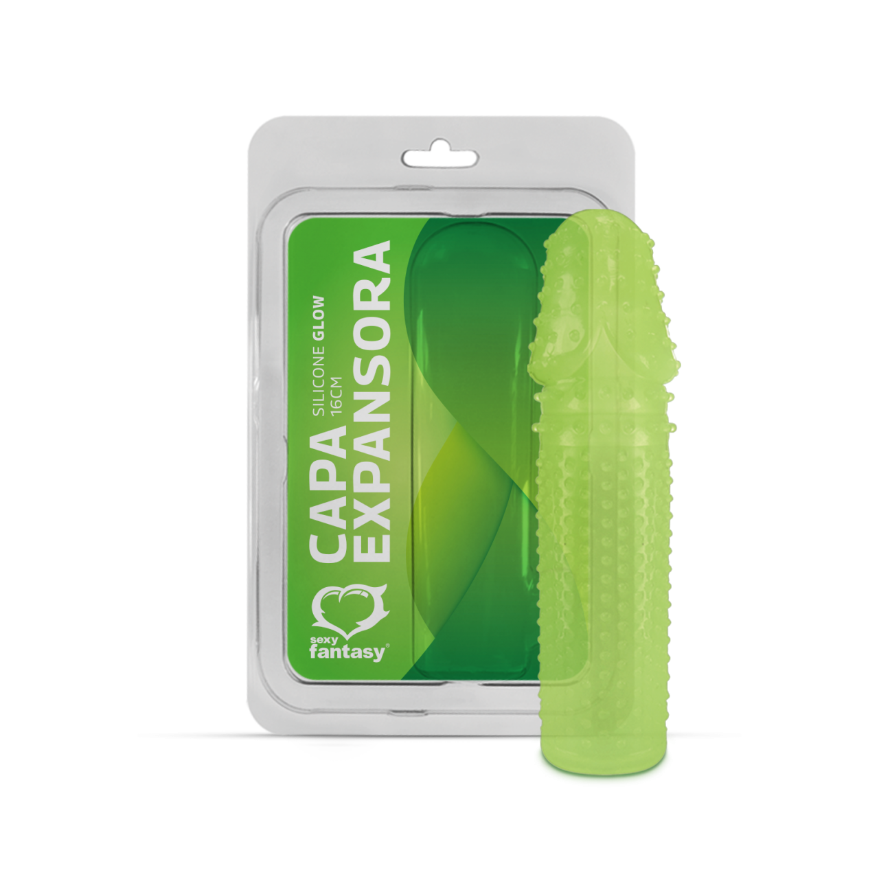 Capa expansora de silicone, ajustável a qualquer tamanho, verde e com pontas massageadoras.
