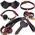kit sado composto por mordaça, venda, coleira com estirante de corrente e guia, chicote, algema e tornozeleira e corrente.